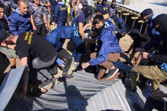 "Активісти ряду патріотичних організацій знову, як і тиждень тому, прийшли на Ланжерон, щоб зупинити незаконне, на їхню думку, будівництво реабілітаційно-оздоровчого центру дельфінотерапії", - йдеться в повідомленні.