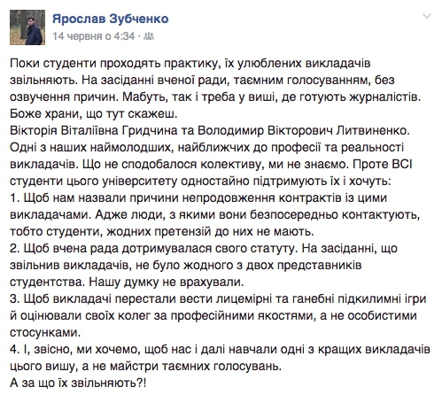 "Поки студенти проходять практику, їх улюблених викладачів звільняють. На засіданні вченої ради, таємним голосуванням, без озвучення причин. Мабуть, так і треба у вузі, де готують журналістів", - написав у Facebook студент Інституту журналістики Ярослав Зубченко.