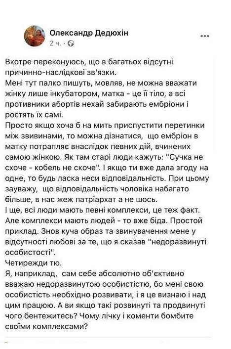 У вівторок, 1 червня, настоятель Свято-Миколаївського храму Православної церкви України в Полтаві 47-річний Олександр Дедюхін опублікував у Facebook два дописи, що різко засуджують дії жінок, які зрештою призводять до абортів.