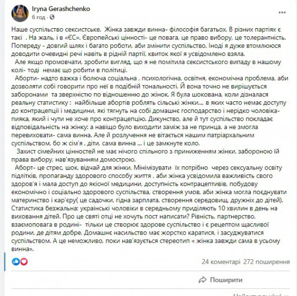 Народна депутатка Ірина Геращенко у вівторок написала у Facebook допис, в якому визнала, що українське суспільство - сексистське, такі люди є в багатьох партіях, і "ЄС" - не виняток.
