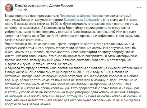 У першому дописі священник назвав "недорозвиненими особистостями" людей, які послуговуються гаслом "моє тіло - моє діло". Також у тексті йдеться про те, тіло жінки не належить їй, як і тіло чоловіка не належить йому, а ембріон в утробі не належить батькам.