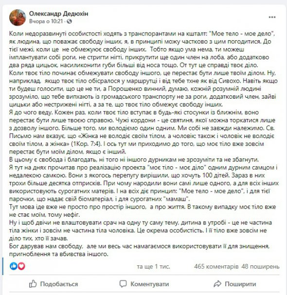 "Це окрема особистість. І її тіло вже зовсім не діло тих, хто її зачав", - написав Дедюхін.