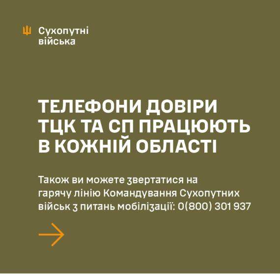 Сухопутні війська Збройних сил України повідомили про телефонні номери для оперативного реагування на будь-які проблеми чи можливі зловживання у роботі ТЦК та СП.