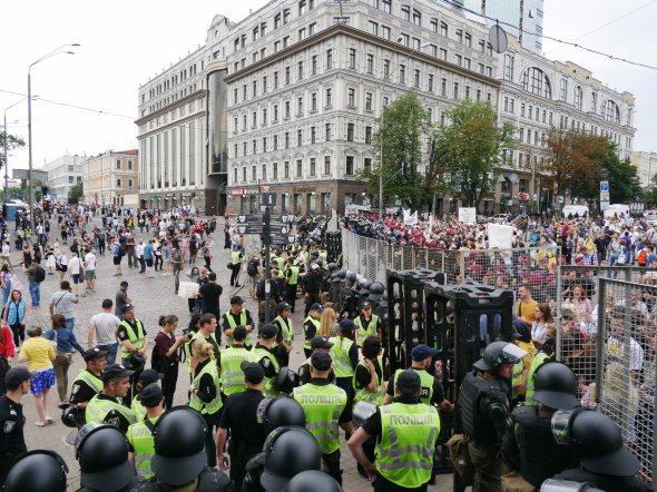 Територію маршруту слідування маршу оточила поліція. Учасників пропускають через металодетектори, ознайомившись із документами та перевіривши вміст сумок.