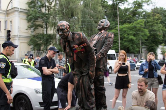 "Ця скульпута символізує, що Марш рівності має відбуватися в Москві, - каже Віталій Чорний із організації "Братство". - Тобто, українські націоналісти виступають за легалізацію одностатевих шлюбів, важких наркотиків, масових примусових абортів на території РФ. Нам не зрозуміло, чого Західний світ підтримав чемпіонат світу з футболу в Москві, а Україні нав'язує гей-паради".