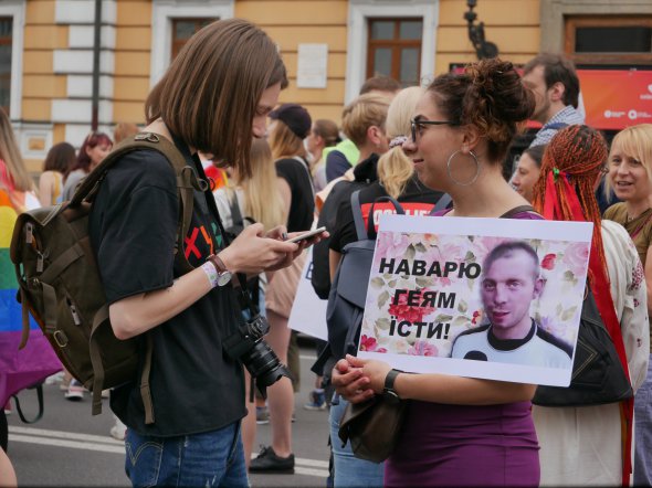 "Це жарт, мем з інтеренету, - каже Ольга, тримає в руках плакат із фото чоловіка та надписом "Наварю геям їсти". - Це хлопець, який не міг зрозуміти, хто варить геям їсти? От я пропоную свої послуги".