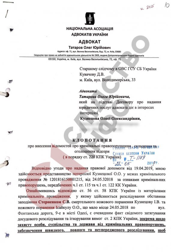 Судячи з документу, датованого 17 травня 2019 року, Олег Татаров представляв інтереси Олесі Кузнецової - дружини Івана Кузнецова, який загинув у травні 2018 року від ножових поранень внаслідок сутички зі Стерненком біля будинку останнього в Одесі. Ще один чоловік - Олександр Ісайкул - тоді отримав поранення.