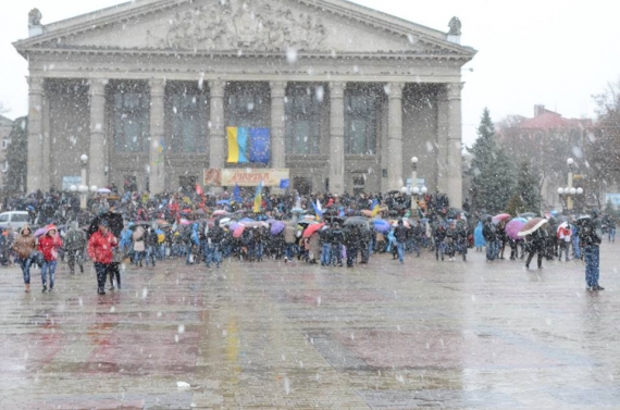 Увечері, попри перший снігопад, на тернопільському Євромайдані є кілька сотень студентів. Вони гріються біля вогню, пригощаються бутербродами і чаєм.