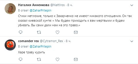 У мережі тут же відповідають, що "терористам місце в пеклі". "Який він росіянин!", "Вірші непогані, тільки до Захарченка не мають жодного відношення", - пишуть у коментарях.