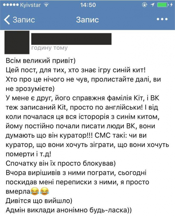 "У мене є друг, який має прізвище Кіт. У соцмережі ВКонтакте він записаний як Kit. І коли почалась історія із "синім китом", йому почали постійно писати люди у ВК. Вони думають, що він куратор. SMS такі - чи він куратор, вони хочуть зіграти і померти. Спочатку він їх просто блокував. А потім вирішив з ними зіграти", - йдеться в описі.