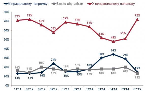 15% українців вважають, що ситуація в країні в цілому розвивається в правильному напрямку, 72% дотримуються думки про неправильному напрямку, свідчать дані опитування соціологічної служби "Рейтинг".