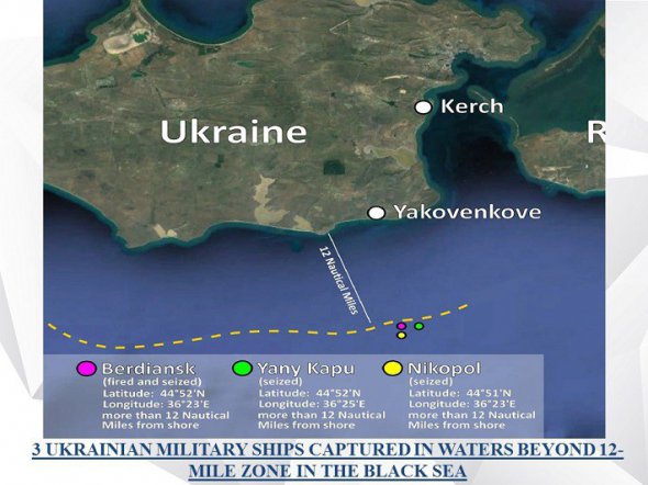 Група українських кораблів переміщувалася з одного українського порту в інший український порт, дотримуючись норм міжнародного законодавства та договору між Україною та Російською Федерацією щодо використання акваторії Азовського моря та Керченської протоки. Українські кораблі не влаштовували ніяких провокацій і були безпідставно атаковані російськими військовими.