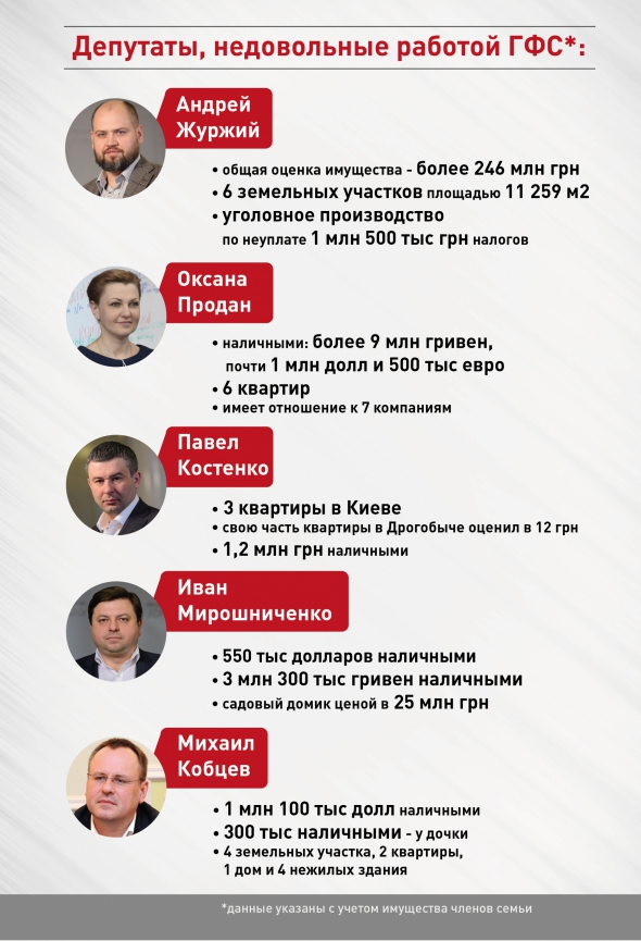 Очолюють рейтинг народні депутати, проти яких Генпрокуратура, за даними Державної фіскальної служби (ДФС), відкрила справи за фактом несплати податків. Поміж "ухилянтів" Нестор Шуфрич ("Опозиційний блок"), Руслан Демчак (фракція БПП), Геннадій Бобов (група "Відродження"), Олександр Супруненко, В'ячеслав Костянтинівський (позафракційні) та Андрій Журжій ("Самопоміч"). Останній зареєстрував у парламенті постанову про відставку глави ДФС Романа Насірова, щоб не платити 1,5 млн грн до бюджету, зазначає "Депо".
