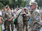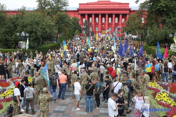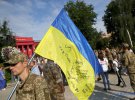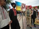 Серед учасників — військові, добровольці, волонтери, учасники Революції гідності. Також із фотографіями загиблих на Донбасі бійців — ідуть їхні родини.