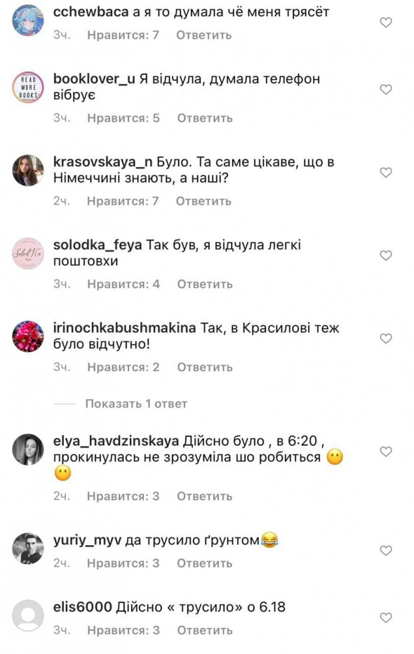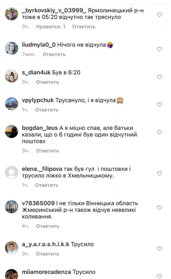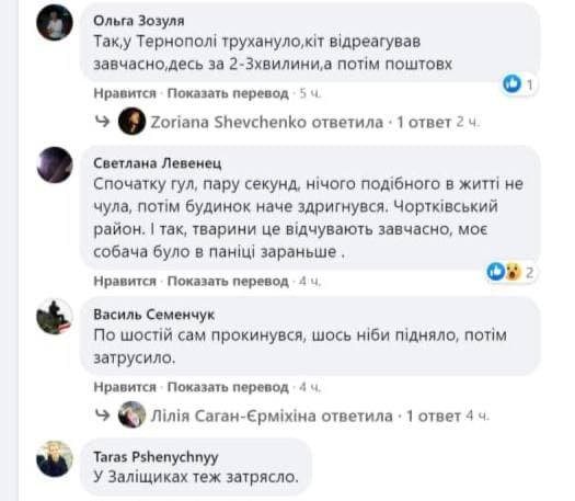 Про слабке тремтіння заявили жителі Вінниччини, Чорткова, Збаража, Городенки, Бучачі та Коломиї. Його відчули навіть у Кам'янець-Подільському, за 80 км від епіцентру. Gazeta.ua пропонує реакцію користувачів соцмереж на інцидент.