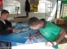 - Це волонтери, — пояснює Дмитро Хулап, 22 роки. — Вони працюють безкоштовно, а футболки отримали як подарунок, — говорить Діма й звертається до молоді. — Оці пусті коробки треба протягом 15 хвилин прибрати!