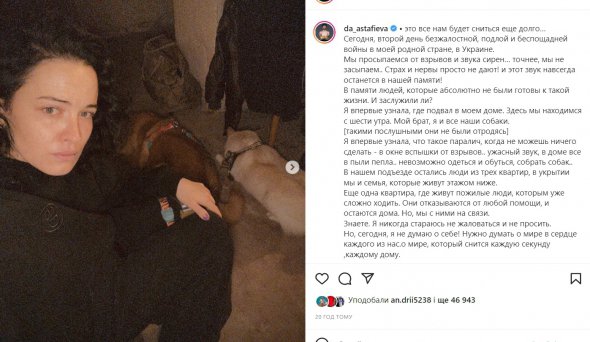 "Сьогодні другий день безжальної, підлої та нещадної війни в моїй рідній країні, в Україні. Ми прокидаємося від вибухів та звуку сирен… точніше, ми не засинаємо… Страх і нерви просто не дають! і цей звук назавжди залишиться у нашій пам'яті! У пам'яті людей, котрі абсолютно не були готові до такого життя. І чи заслужили? Я вперше дізналася, де підвал у моїй оселі. Тут ми перебуваємо з шостої ранку. Мій брат, я й усі наші собаки. [такими слухняними вони не були зроду]