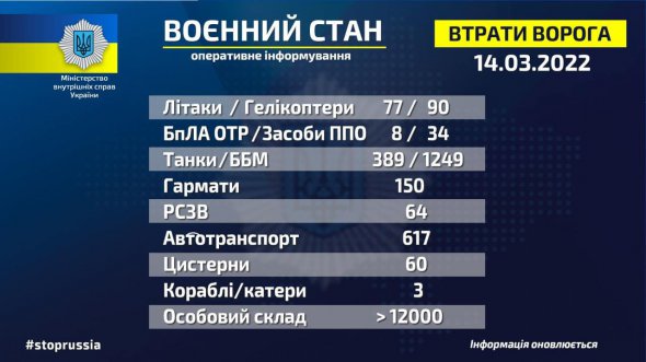 Втрати особового складу російського ворога станом на ранок 14 березня орієнтовно становлять понад 12 тис. осіб.