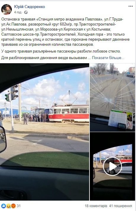 "У одному трамваї розлючені пасажири розбили лобове скло", - йдеться в дописі.