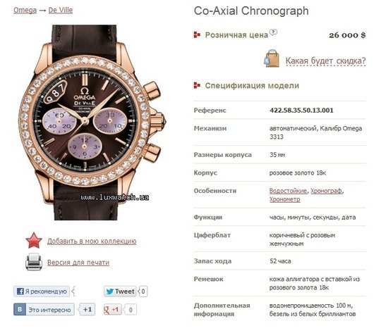 Вартість такого виробу фірми Omega в одному з інтернет-магазинів сягає 26 тисяч доларів. Такий годинник виконаний з рожевого золота, а ремінець - зі шкіри алігатора. Годинник водостійкий.
