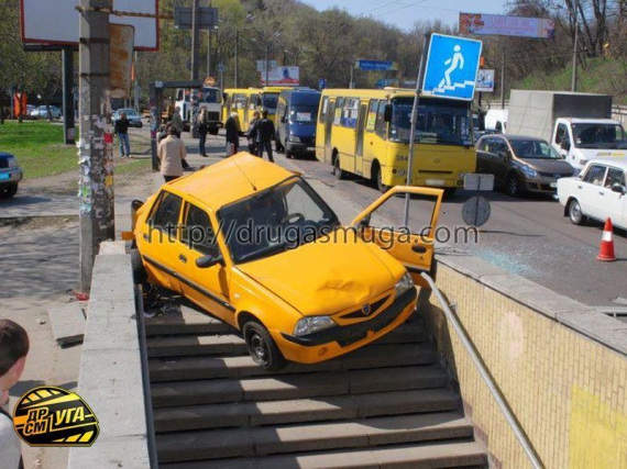 Автомобіль Dacia на великій швидкості їхав у бік Петрівки. Раптово, біля Кирилівської церкви водій втратив керування. В результаті машина вилетіла на тротуар, збила сміттєвий бак і врізалася у стіну підземного переходу, а потім повисла на сходах у момент, коли сходами переходу піднімалася дівчина.