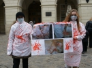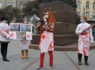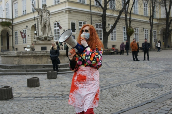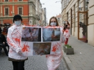 П'ятеро дівчат у заляпаних червоню фарбою медичних халатах закликали не відвідувати заклад, де знущаються над тваринами. У руках тримали фото, на яких видно, що працівники закладу на сцені вбивають свиню.