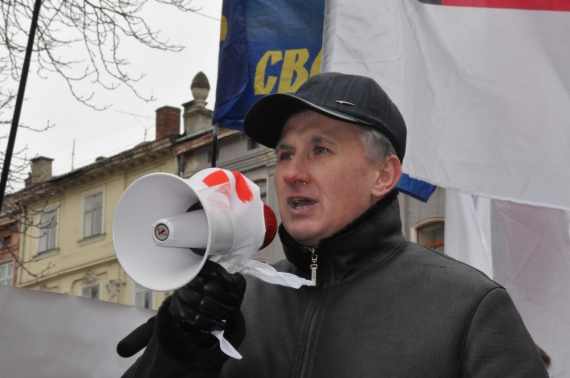 Сьогодні, 25 лютого, у центрі Львова відбулися дві політичні театралізовані акції на честь третьої річниці правління Віктора Януковича. Їх окремо організували ВО "Свобода" та Батьківщина.