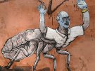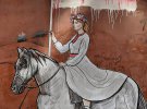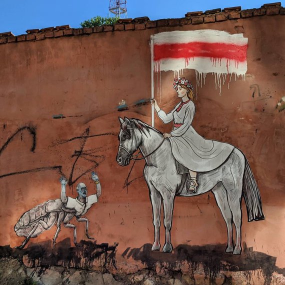 На барвистому графіті Олександр Лукашенко зображений в образі таргана, який підняв руки перед дівчиною на коні.