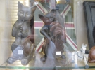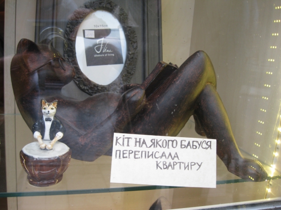 На вітрині однієї з крамниць лежить литий з металу кіт, який читає книгу, поважно закинувши лапу на лапу. Поруч написана від руки табличка: "Кіт, на якого бабуся переписала квартиру".