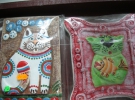 У більшості крамниць фотографувати крам забороняють. Але котів тут шукати далеко не треба. Керамічні картини із зображенням котів висять при вході. Клацаю рудого кота в зеленому циліндрі за 70 гривень на вулиці Руській. Поруч з ним за таку ж ціну - зелений і плямистий з підписами "Мій котик". Котів зображують у стилі наївного живопису, часом у стилі жлобарту.