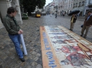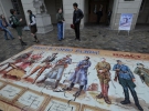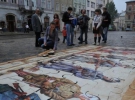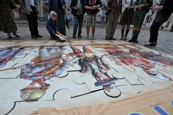 Назва пазлу - "Вчимо історію разом". Розмір збірної картини 6х3 м, складається з 138 металевих частин. Людей на площі мало, перехожі оглядають мозаїку та ідуть далі.