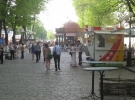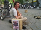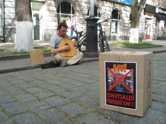 Поруч з кав'ярнею двоє чоловік колом розставили картонні ящики, до кожного прикріпили роздруковані на принтері аркуші з перекресленою жирним червоним хрестом фотографією "Коффішки" й підписом "Ні окупації пішохідної зони". Організатор акції художник Дмитро Яцько сів на землю й заграв на бандурі.