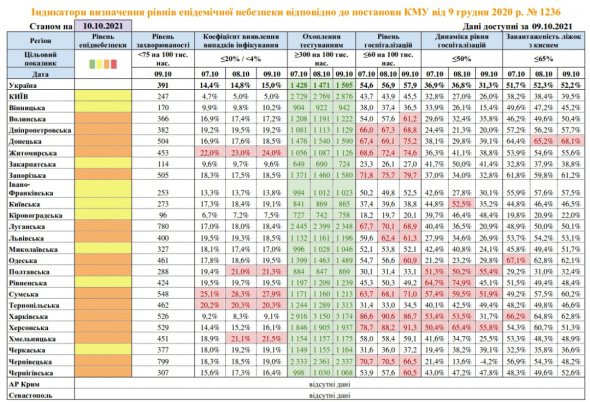 "Станом на 10 жовтня рівень захворюваності в країні становить 391 на 100 тисяч населення за визначеного показника 75. У Києві він становить 247 на 100 тисяч населення", - йдеться у повідомленні.