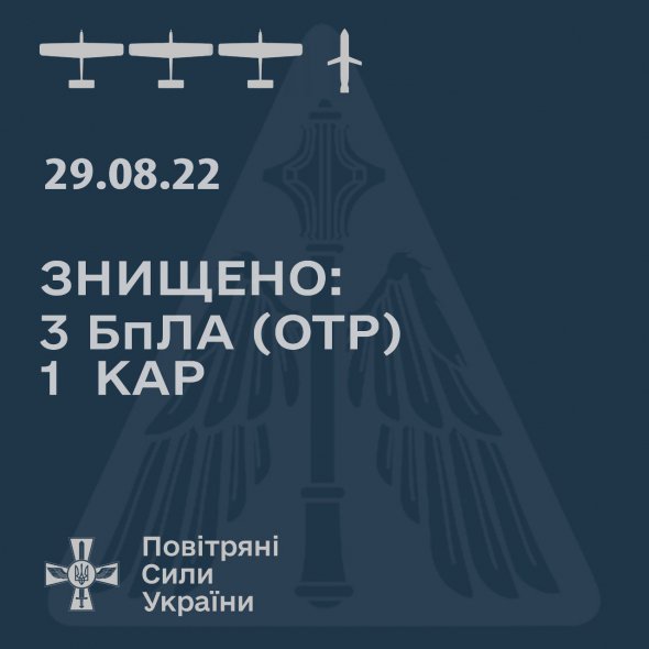 29 липня підрозділи Повітряних сил Збройних сил України знищили три ворожі безпілотники оперативно-тактичного рівня та одну керовану авіаційну ракету класу "повітря-поверхня" Х-59.
