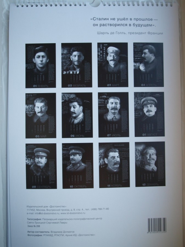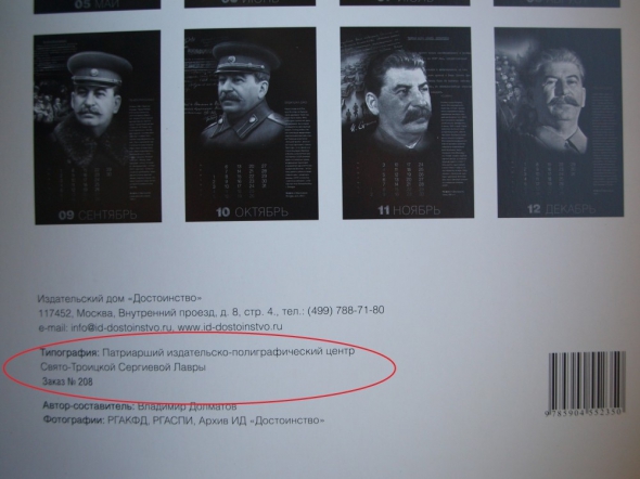Календар на 2014 рік зі зображеннями Йосипа Сталіна надрукував патріарший видавничо-поліграфічний центр Свято-Троїцької Сергієвої Лаври, який знаходиться в Московській області РФ. Про це в Живому журналі написав доктор історичних наук, професор РДГУ Михайло Бабкін, передає Цензор.НЕТ.