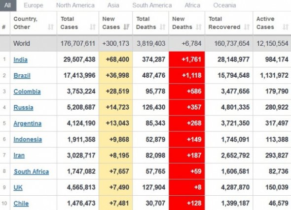 В Індії зареєстрували 68 тис. нових випадків, у Бразилії – 37 тис., а в Колумбії понад 28 тис. випадків. Багато інфікованих також у РФ - понад 14 тис. Далі за кількістю хворих у рейтингу знаходяться Аргентина та Індонезія.