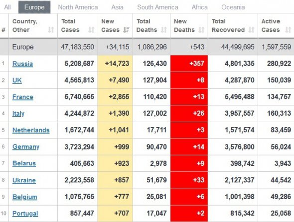 Росія при цьому перша в Європі й четверта у світі за поширенням коронавірусу, свідчать дані Worldometers. Україна серед країн світу займає 48 місце за кількістю нових інфікувань, а серед країн Європи – восьму позицію.