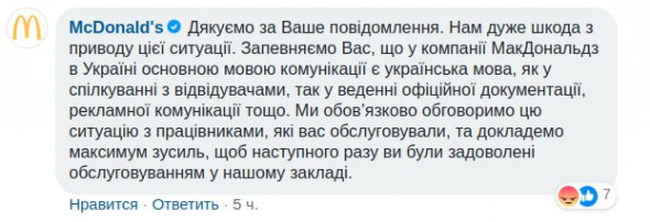 "У McDonald's на Осокорках на Осокорках відмовились обслуговувати українською мовою. За прохання обслужити єдиною державною мовою - хамство в мою сторону", - написав у своєму Facebook громадський активіст Андрій Смолій.