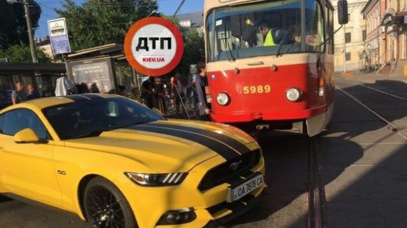 Рух транспорту перекрив жовтий Ford Mustang 5-го покоління, який коштує 50 тисяч доларів. Згідно із номером автівки (ОА 7878 СА), вона має одеську реєстрацію. Можливо саме через це водій не знає "нюанси" парковки в столиці, перш за все те, що це не можна робити на трамвайних коліях.