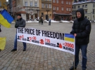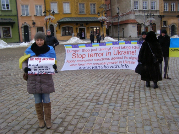 "Ціна за свободу? 6 убитих, 30 зниклих, 116 заарештованих, більш ніж 2000 поранених", "Підтримка польських сердець відгукнулася подякою України", "Стоп кривавому режиму Януковича" – написано на плакатах і транспарантах. Перехожі підходять, читають, цікавляться у демонстрантів актуальною ситуацією в країні.