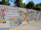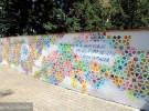 Мурал виглядає як велика мозаїка, якою викладено сентенцію "Різні для того, щоб познайомитись ближче".