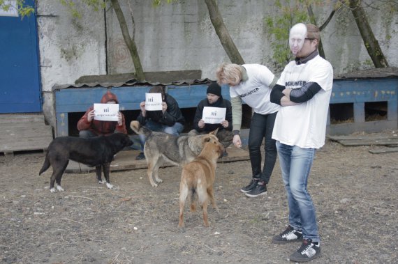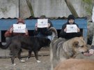 Перед входом на територію волонтери розігрують сценку. На футболках мають напис "доґгантер" (громадяни, які самовільно винищують безпритульних тварин. - Gazeta.ua).
