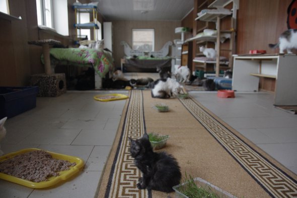 Подалі від вольєрів на підвищенні будинок для котів. Усього їх у притулку понад 300. У головній кімнаті стоїть дерев'яна чотириповерхова конструкція з круглими отворами.