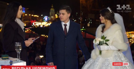 Весільну церемонію показали у прямому ефірі новорічного випуску ТСН. Її провела майстер церемоній Марина Лелик.