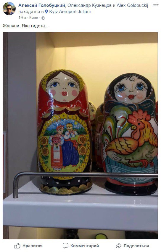 В аеропорту імені Сікорського (Жуляни) у якості сувенирів продаються російські матрьошки. Про це у Facebook написав заступник директора Агентства моделювання ситуацій Олексій Голобуцький та виклав відповідне фото.