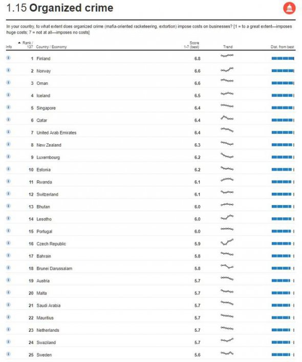 Рейтинг складався на основі даних за 2015-2016 роки. Оцінки від 1 до 7 виставлялися відповідно до рівня впливу організованої злочинності на бізнес.