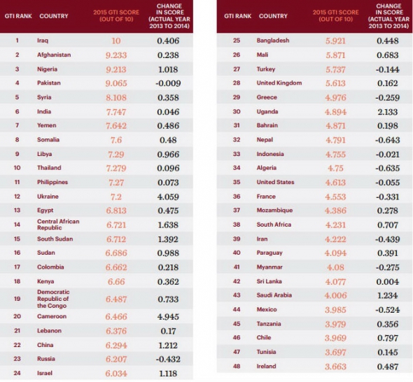 До першої десятки Global Terrorism Index входять Ірак, Афганістан, Нігерія, Пакистан, Сирія, Індія, Ємен, Сомалі, Лівія та Таїланд. Серед сусідів України до першої частини рейтингу входять також Росія (23 місце) та Туреччина (27 місце).