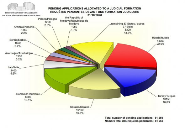 Українські скарги становлять 16,5% всієї завантаженості ЄСПЛ. На 1-му місці незмінно знаходиться РФ із 14 050 скаргами, а це майже чверть від загальної кількості скарг - 22,9%. На 2-му місці Туреччина, у якої 16,6%.