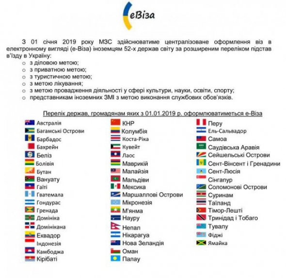 З 1 січня 2019 року МЗС України буде проводити оформлення віз в електронному вигляді для громадян 52-х країн світу. Про це повідомили в прес-службі відомства.