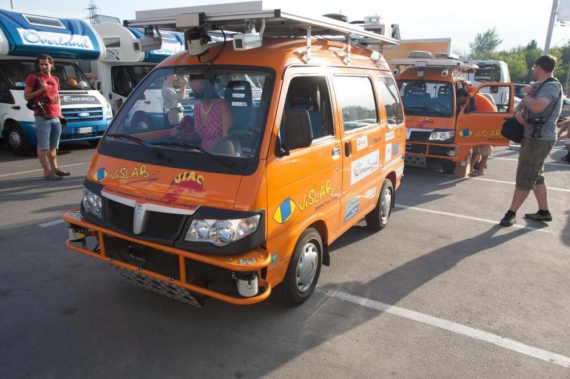 5 серпня італійці на день заїхали до Києва. Оранжевий електромобіль зовні схожий на мікроавтобус. Машина їде самостійно й дуже тихо. Середня швидкість – 50 км за год. В електромобілі є електронний автопілот. Сенсори контактують із комп'ютером. Можна чітко розпізнати машину, що рухається попереду, й постійно їхати за нею без водія, - пояснив інженер Пьєр Паоло Порта.